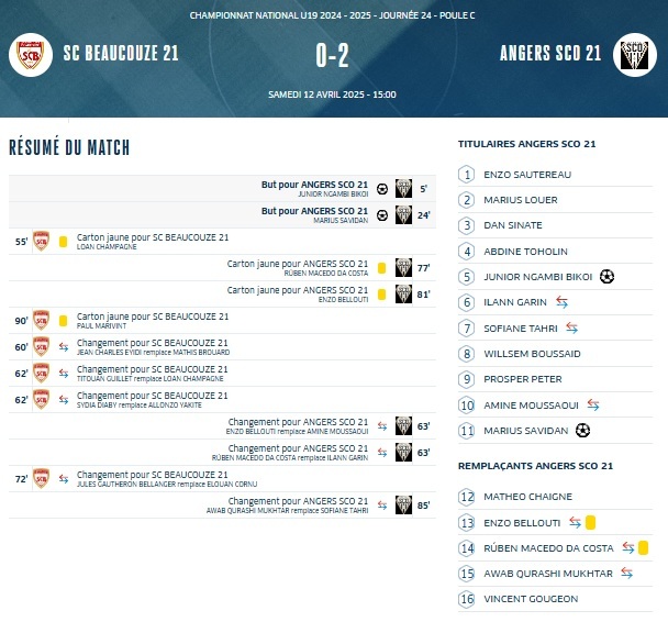 Match terminé, victoire du SCO vs Beaucouzé 0-2