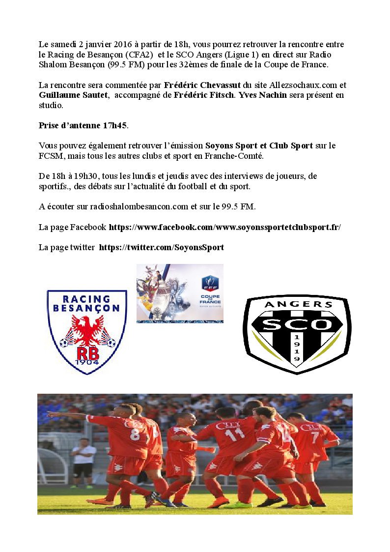 Vous pouvez réécouter l'émission Soyons Sport et le Club Sport du lundi 28/12. Au programme, les 32èmes de Finale de la Coupe de France de Football entre le Allez le RB - Racing Besançon contre le Angers SCO, et l' AS Pagny contre le FC Sochaux-Montbéliard.